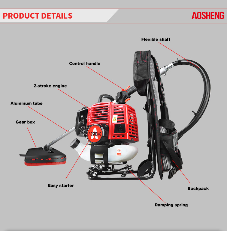 고성능 4행정 엔진, 변위는 38CC입니다. 열린 황무지에서의 전문적인 사용 튜브 크기 26mm*1.5mm, 강도 유연한 샤프트. 절단 폭은 420mm입니다. 수명은 150시간 이상입니다. 새로운 디자인 가이드 표지.