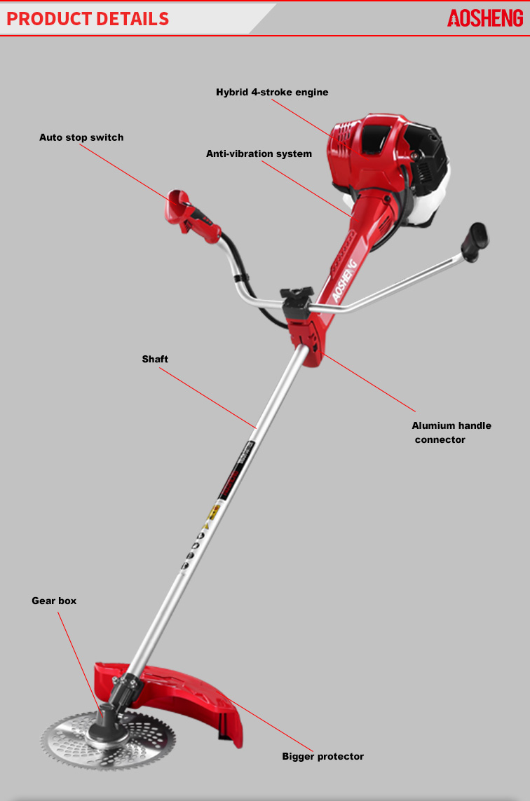 고성능 4행정 엔진, 변위는 38CC입니다. 열린 황무지에서의 전문적인 사용 튜브 크기 26mm*1.5mm, 강도 유연한 샤프트. 절단 폭은 420mm입니다. 수명은 150시간 이상입니다. 새로운 디자인 가이드 표지.