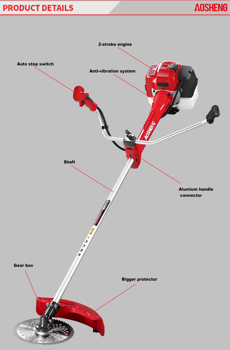 전문적인 엔진, 강력한 힘. 낮은 소비, 시작하기 쉽습니다. 360° 회전 폴 부분은 댐퍼 커버를 사용하고 있습니다. 제어 핸들은 180° 회전하여 흡수를 줄일 수 있습니다. 고무로 덮인 손잡이는 사용자를 편안하게 만듭니다. 트리머 헤드는 460mm의 절단 폭을 제공할 수 있습니다. 합금 블레이드 직경은 10인치입니다.