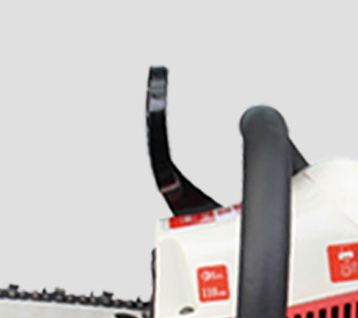 | 02브레이크 보호 장치브레이크 반응이 민감하여 작동 안전성이 향상됩니다. 전면 핸들바와 후면 핸들바가 일체형으로 제작되어 심플하고 견고한 구조입니다. 장치를 누르면 체인톱이 정지됩니다. |